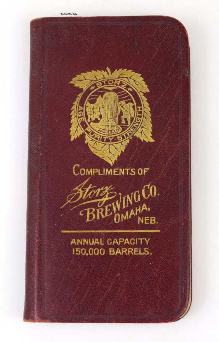 Booklet with the selling points of Storz beer and plenty of blank pages to write notes. Several lithographs of Storz bottles of the era. Also has calendars for 1914. Leather bound with a beautiful factory scene centerfold. About 50 pages. Measures about 2½ x 5 inches tall.