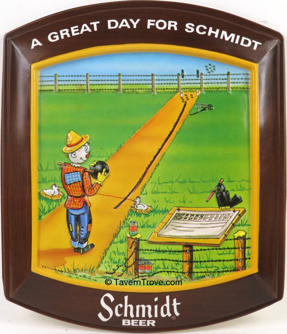 This is a NOS Vacuform sign in unused condition. It features a cartoon by George J. Stuber depicting a bowling scarecrow drinking a can of Schmidt beer. Two chickens are holding the foul line (or fowl line), a crow is keeping score, and the rest of the 6 pack is on the ground. The scarecrow tried to cheat and he used a plow to cut in a ball track into the lane but all he got was the dreaded 7-10 split. The groove is debossed. The sign measures 12 x 14 inches tall.