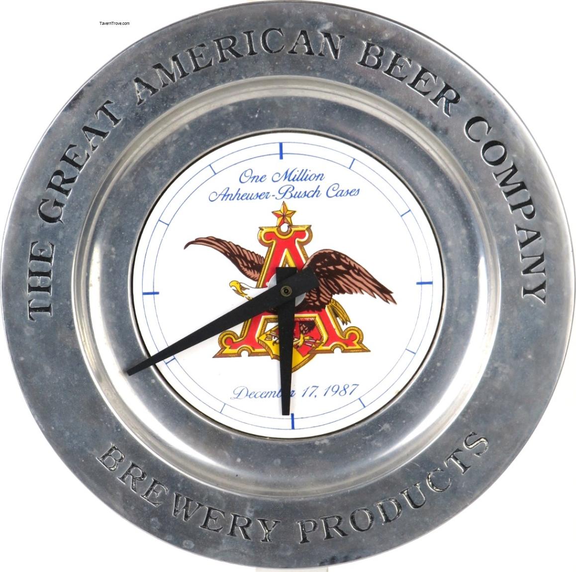 Pewter. Measures 11" by 2" deep and weighs about 2 1/2 lbs. The front reads, "The Great American Beer Company Brewery Products." The center is a ceramic tile that reads, "One Million Anheuser Busch Cases December 17, 1987.