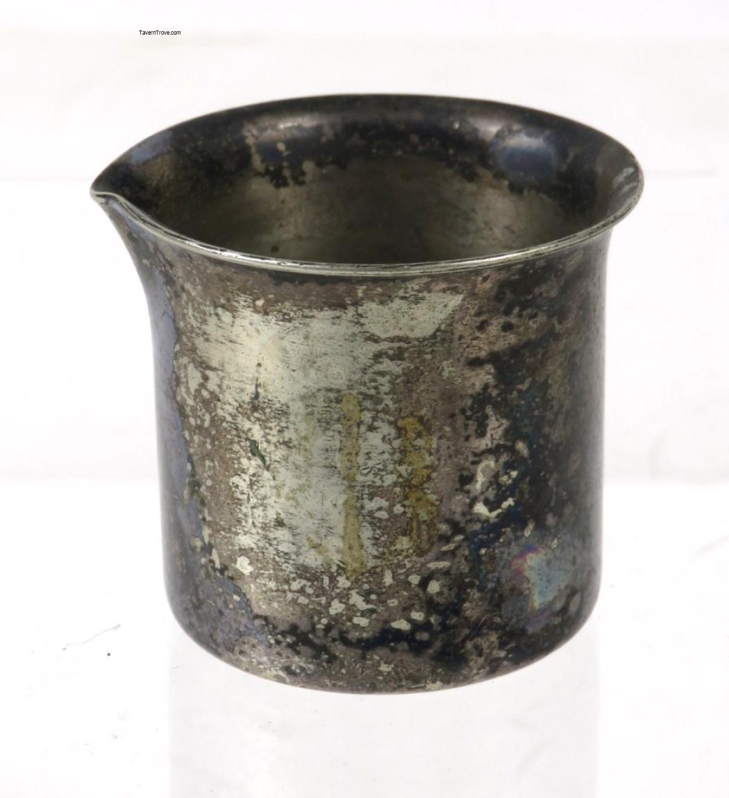 Small mysterious vessel with a pouring spout. Sheffield Nickel Silverplate. Measures just under 2 inches tall. Stamped "Budweiser' on the bottom. Tarnished, but in excellent condition.