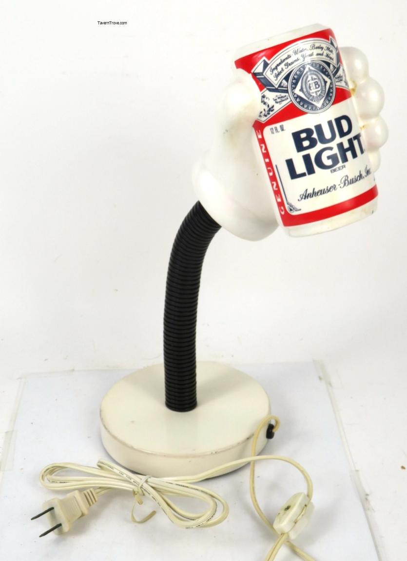 Novelty desk lamp in the form of a gloved hand (looking suspiciously like the hand of Mickey Mouse) holding a can of Bud Light beer. The can and hand are made out of ceramic. 14" tall extended to its full height, 5.5" diameter at the base. Mark: UL label on side of base.
