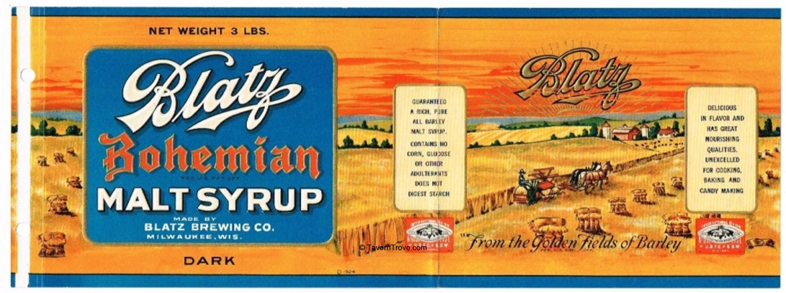 Very graphic embossed label. Contents 3 Pounds. "Dark" in center. Creased. Holes punched at left. Measures about 14 inches long.
