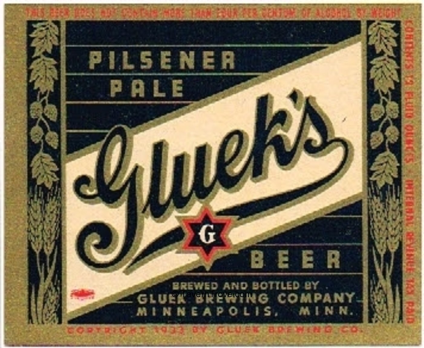 Alcohol mandatory variation: "This Beer Does Not Contain More Than 4 Per Centum..." Across Top.