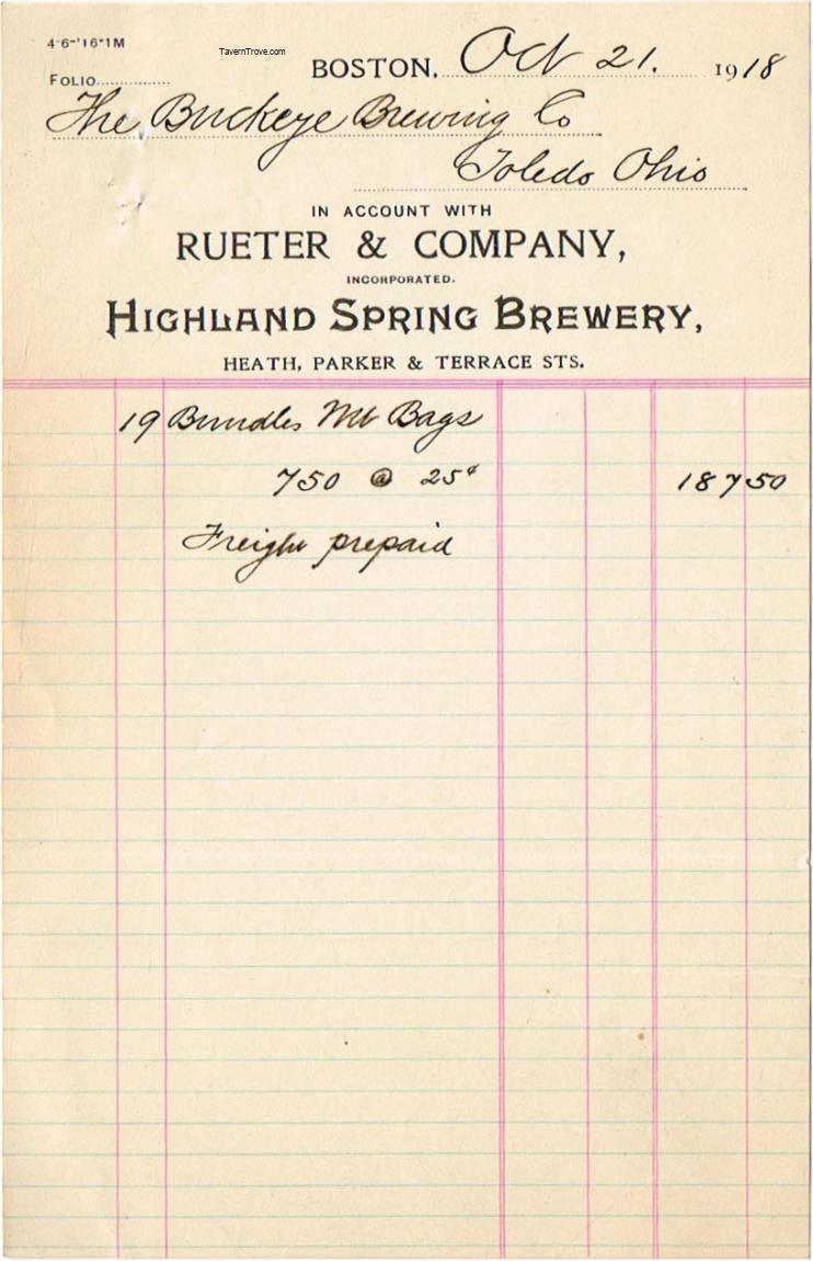 Bill for malt to the Buckeye Brewery of Toledo, Ohio.