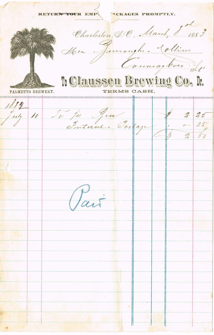 Claussen Palmetto Brewery Billhead Letterhead Item #104432