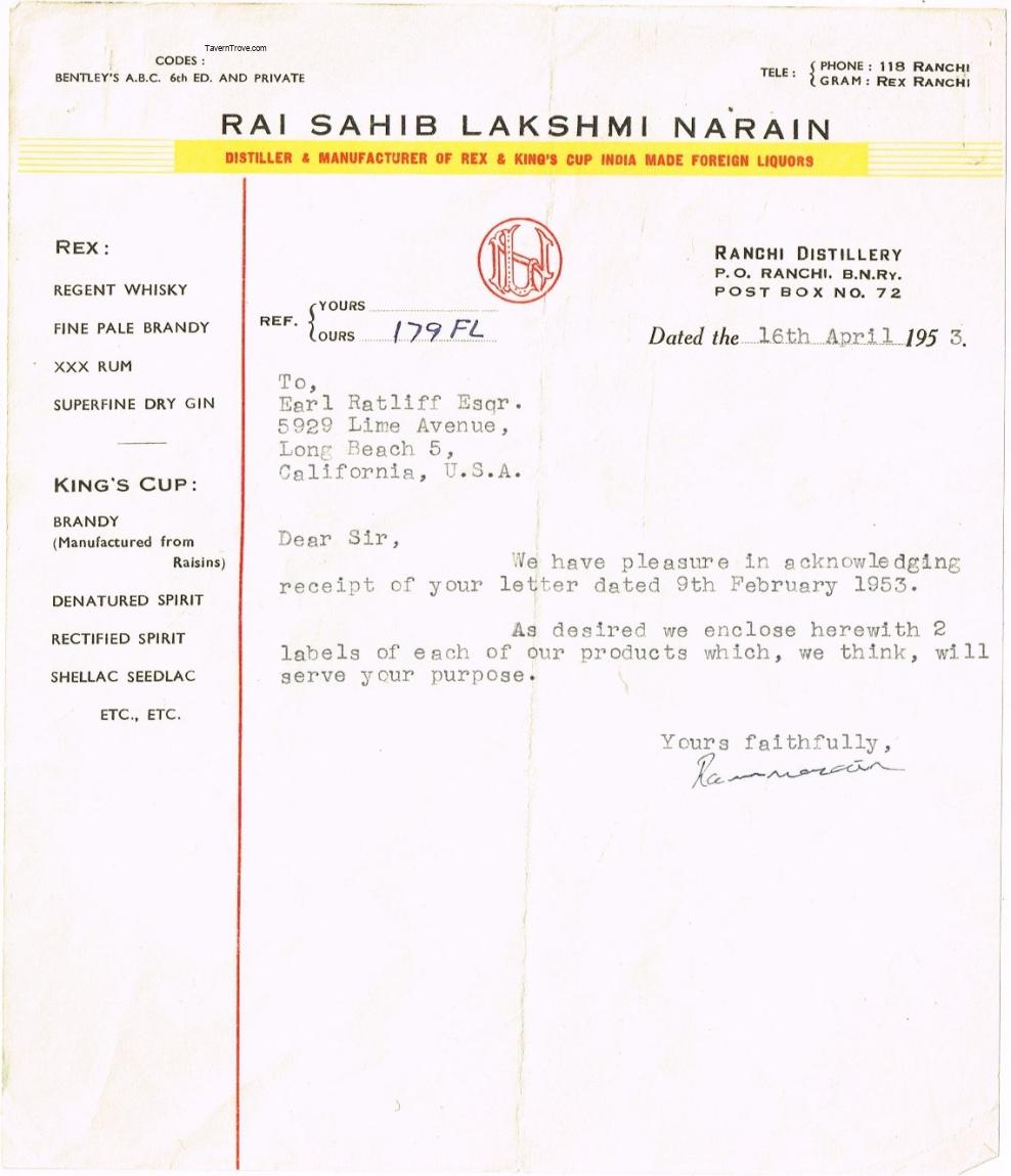 Rai Sahib Lakshmi Narain Ranchi Distillery India Letterhead Item #104319
