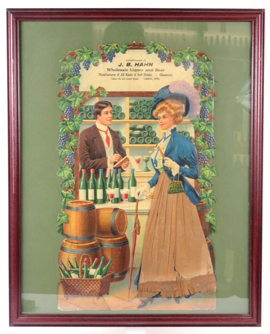 This saloon existed between about 1900 and 1907. Unique Die cut featuring a lady with a real crepe paper dress. She is purchasing wine at the counter, being waited on by a well-dressed man. Measures 18 x 23 inches in the frame. Die cut measures 12 x 20 inches tall. Some wear to the sharp edges and corners, especially at the top and bottom. Her crepe paper dress is torn. It was probably displayed at some point.