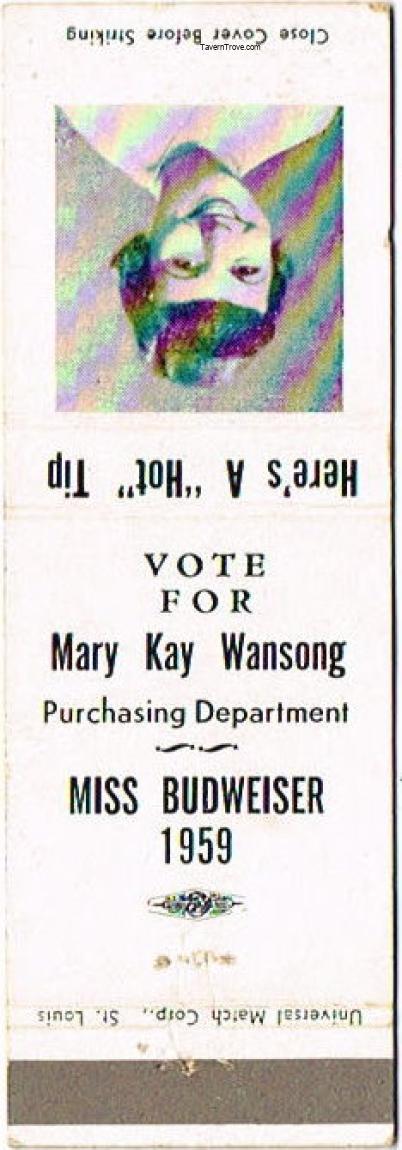 "Vote for Mary Kay Wansong for Miss Budweiser 1959"