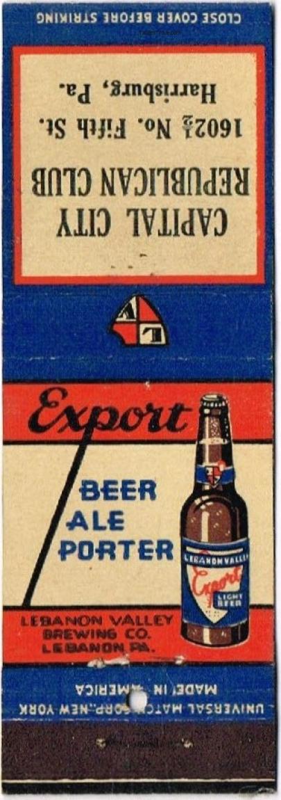 Lebanon Valley Export Beer/Ale/Porter Matchcover Item #24988