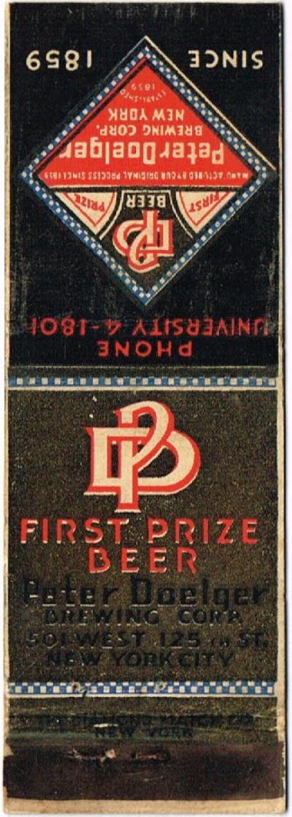 Peter Doelger First Prize Beer Dupe Matchcover Item #112646