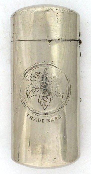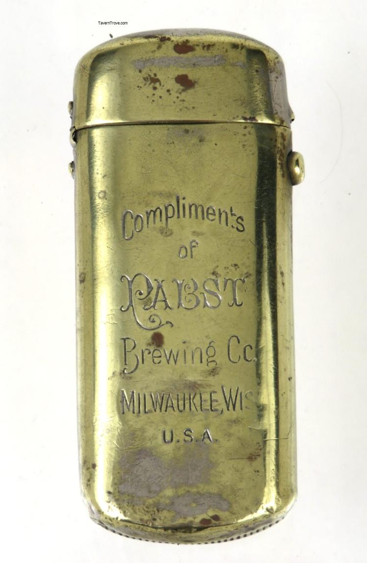 Early nickel-plated brass match safe. Push-button mechanism. Safe has "pocket wear". "Compliments of Pabst Brewing Co." Measures about 3 x 1¼ inches.