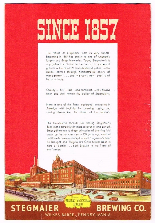 The House of Stegmaier from its very humble beginning in 1857 has grown to one of America's largest and finest breweries. Today Stegmaier's is a prominent Institution in the nation. Its successful growth is the result of well deserved public confidence, earned through demonstrated ability of management and the consistent quality of its products. Quality... first—last —and foremost... has always been and shall remain the policy of Stegmaier's.