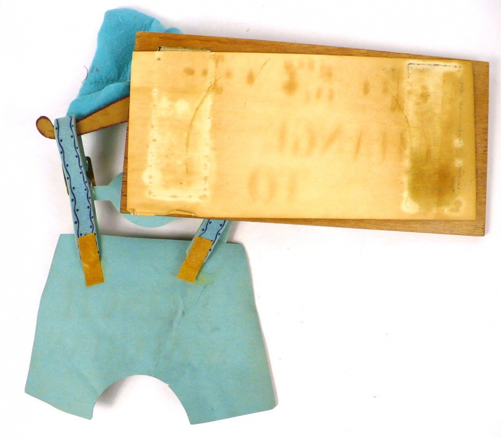 Very cute wood and cloth sign. The woodportion measures about 10 x 5 inches. I can't imagine many of these survived the last 60 years.