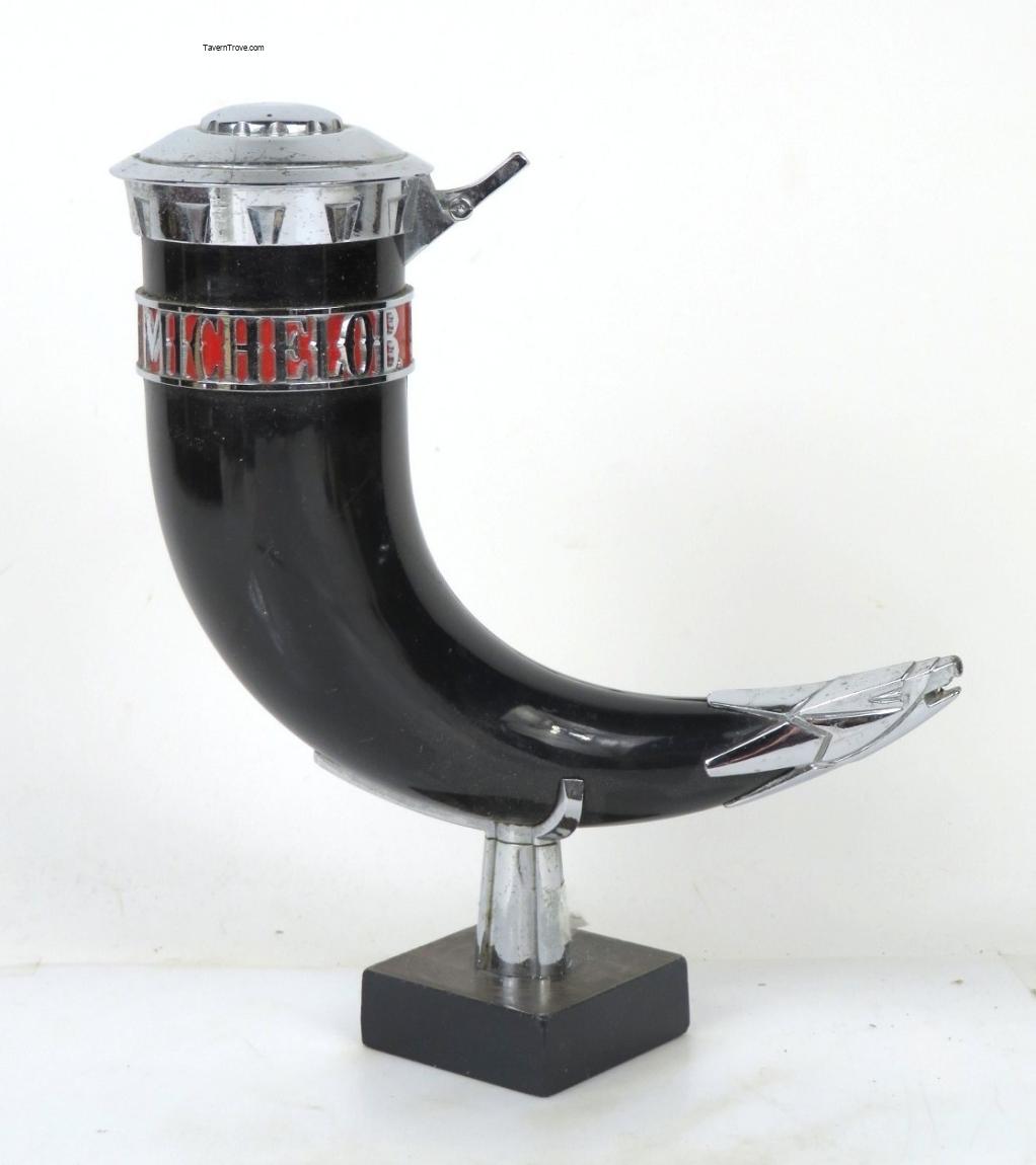 Hard plastic tap handle in the shape of a drinking horn. Worn from use and storage.