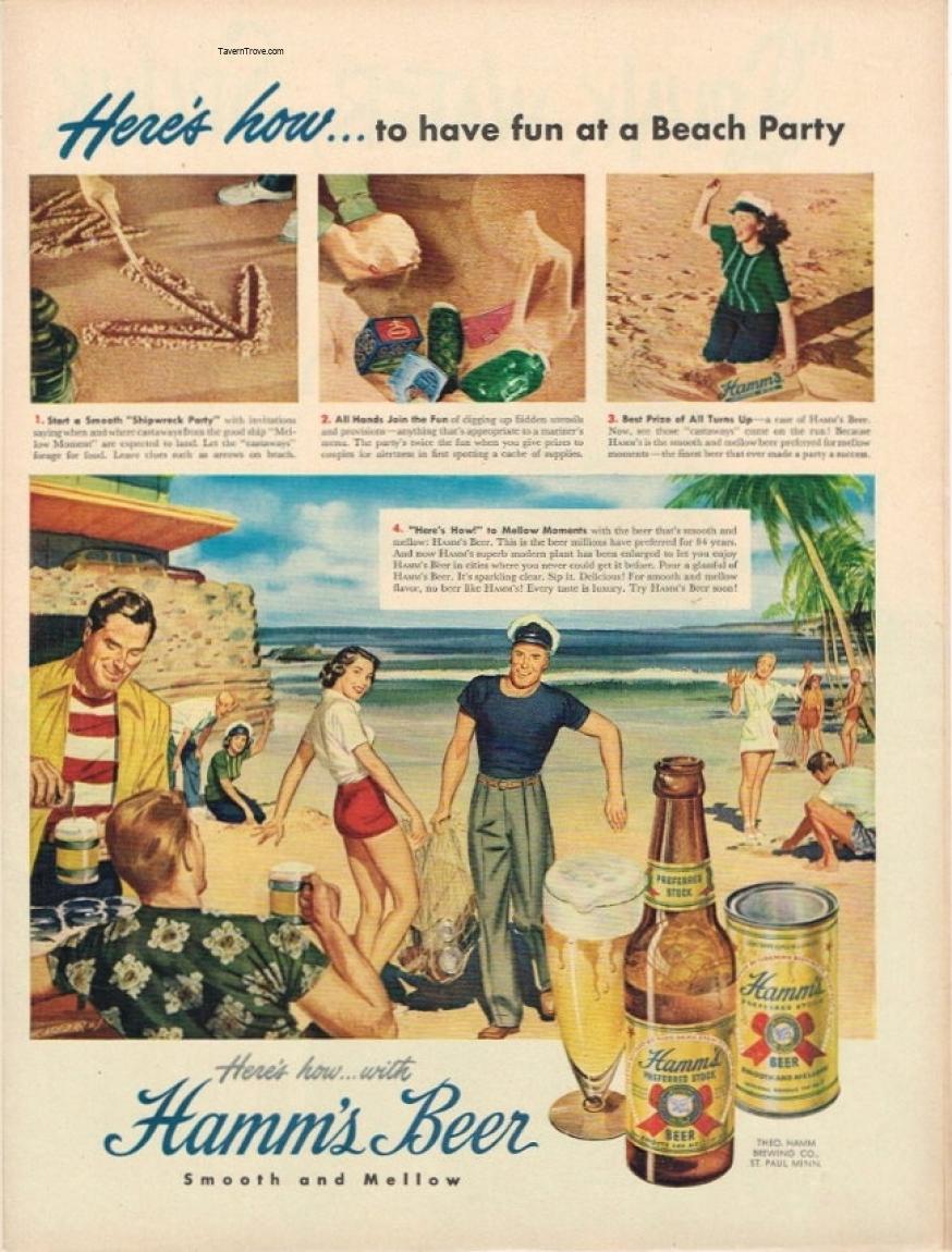 4. "Here's How!" to Mellow Moments with the beer that's smooth and mellow: HAMM'S Beer. This is the beer millions have preferred for 84 years. And now HAMM'S superb modern plant has been enlarged to let you enjoy HAMM'S Beer in cities where you never could get it before. Pour a glassful of HAMM'S Beer. It's sparkling clear. Sip it. Delicious! For smooth and mellow flavor, no beer like HAMM'S! Every taste is luxury. Try HAMM'S Beer soon!