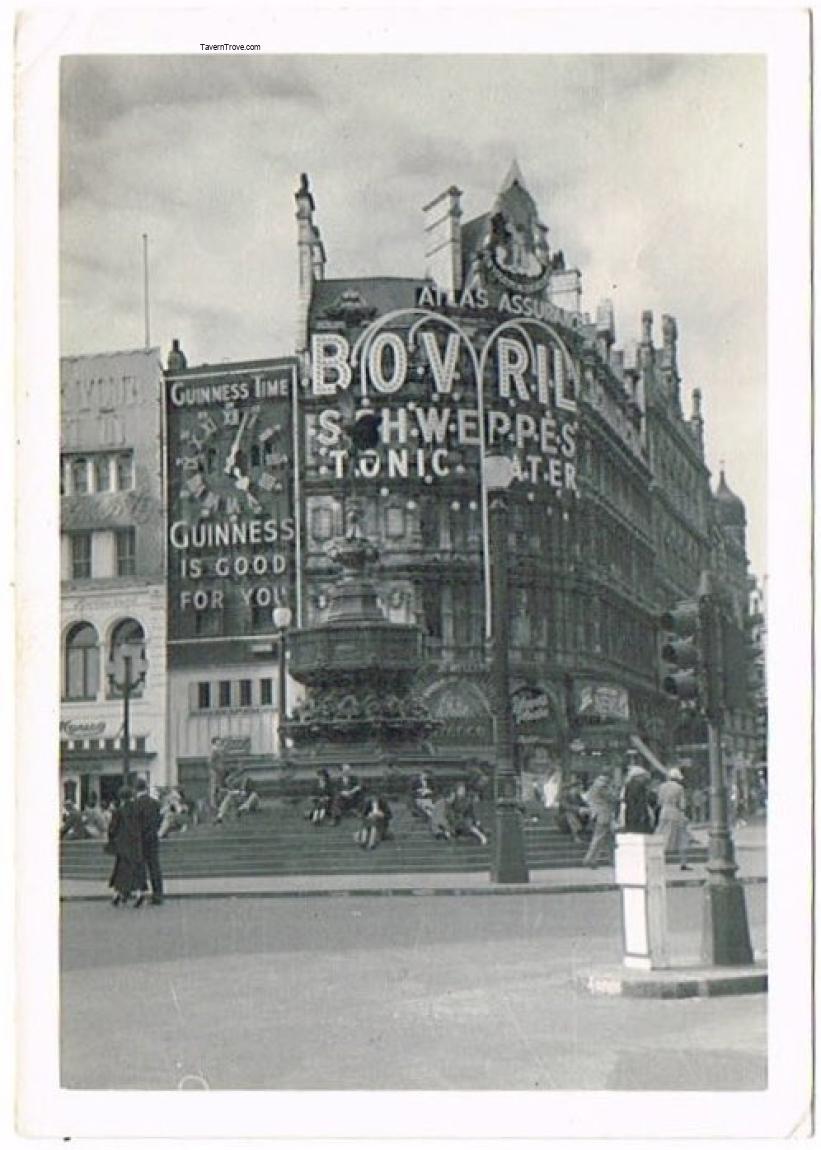Shaftesbury Fountain in Piccadilly Circus with a 40-foot-tall Guinness neon clock. Original 1950s photo. Measures 3¼ x 4½ inches.