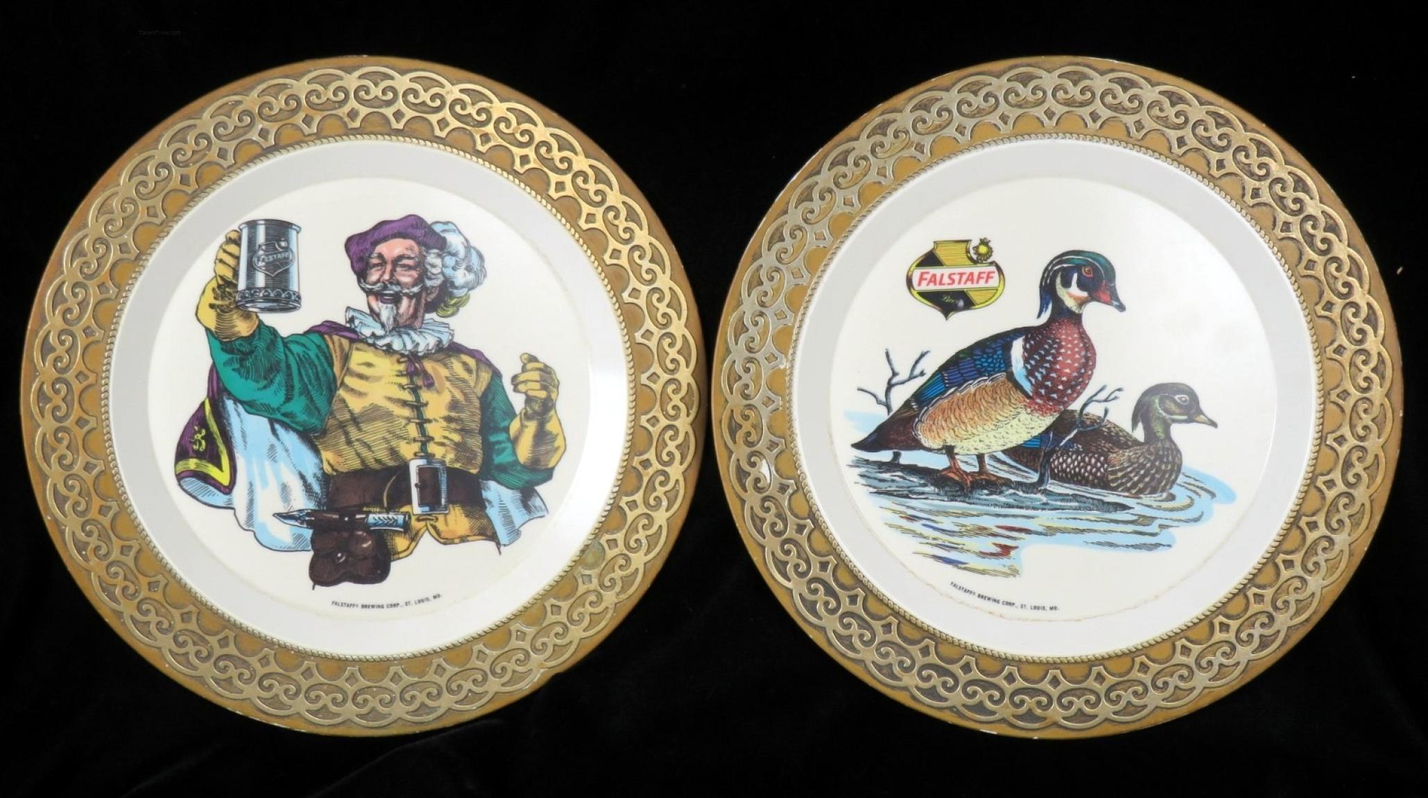 Two of a set of three plastic plates from Falstaff. Very good condition, as shown in the photos. Each measures 10 inches in diameter.