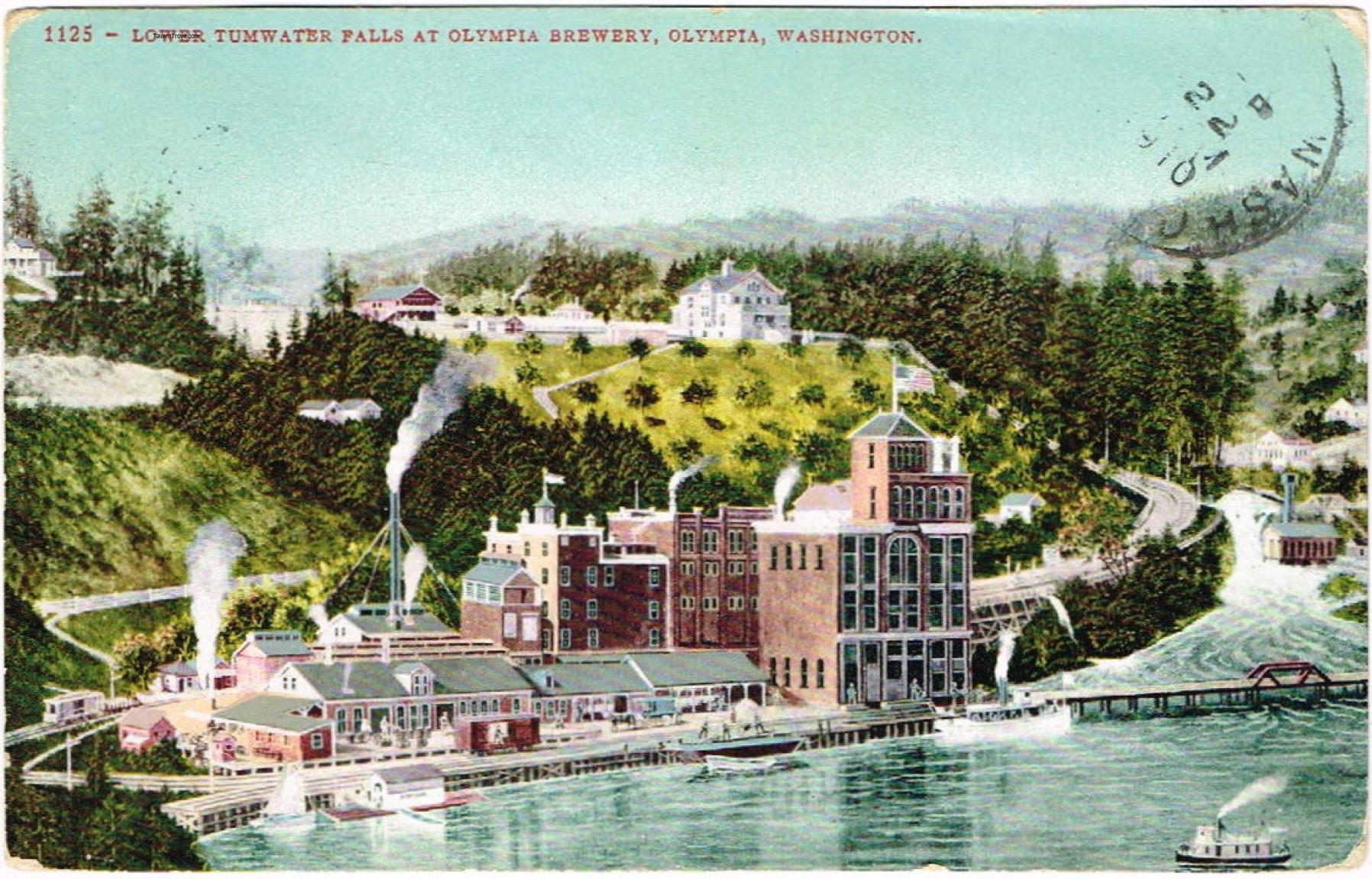 Artist's rendition of the factory at Olympia Washington. Shows steamships and sailboats docking and the famous falls. Worn edges and corners, as shown in the scans.