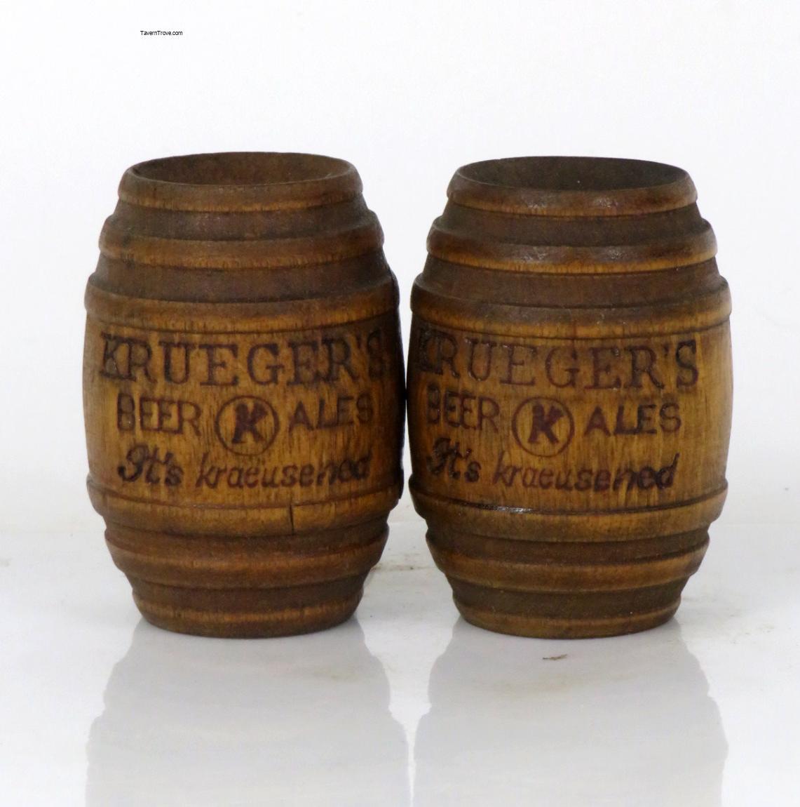 This is a beautiful and rustic set of two Krueger's Beer and Ale salt and pepper shakers in the shape of beer kegs. Made from one piece of turned wood, they date from the middle of the last century and are quite scarce. Some light wear from use and storage. Each measures about 2½ inches tall.