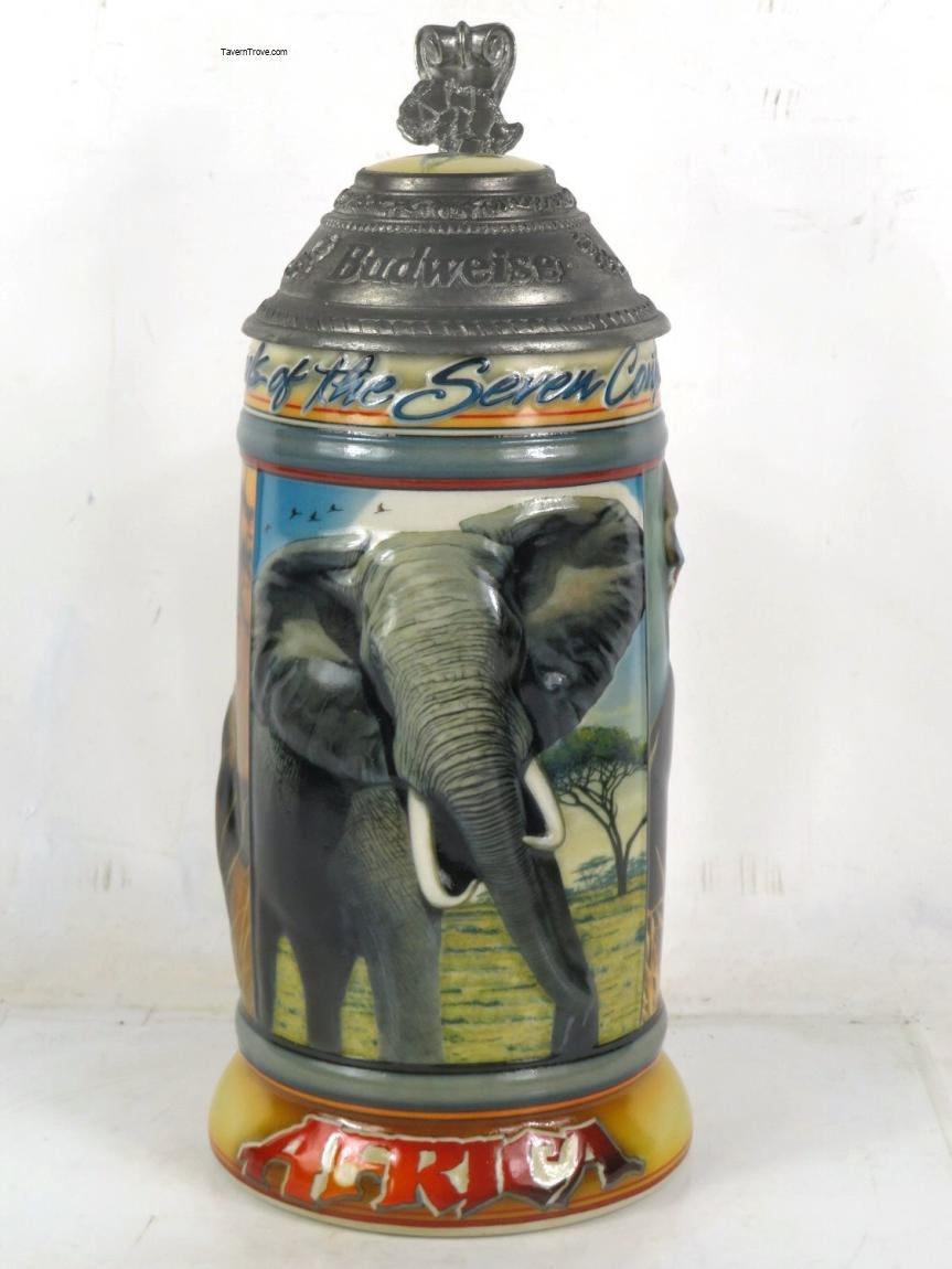 Never displayed, like new condition. The 1st in Budweiser's Animals of the Seven Continents series of lidded steins. Features a lion, elephant and a mandril on the body of the stein. A pied hornbill is featured on the ceramic insert in the pewter lid. The thumbrest is in the shape of the continent of Africa. Individually numbered and comes with a certificate of authenticity.