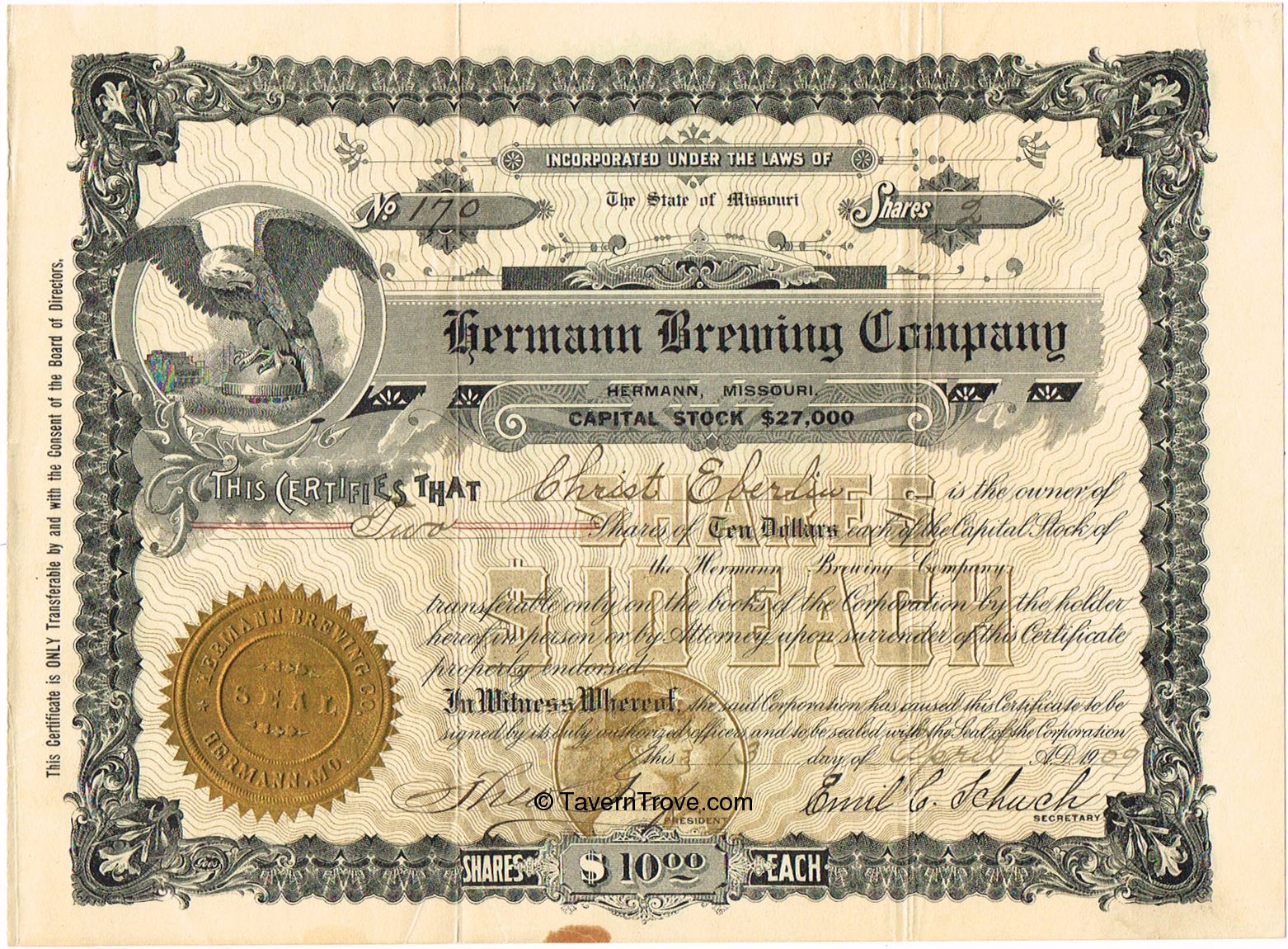 Hermann Brewing Co. Stock Certificate Item #27964