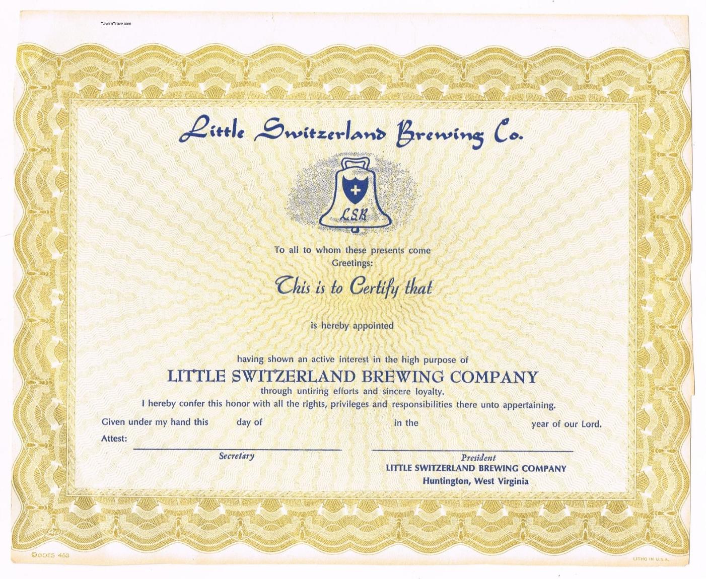 Little Switzerland Brewery Loyalty Certificate Stock Certificate Item #100063