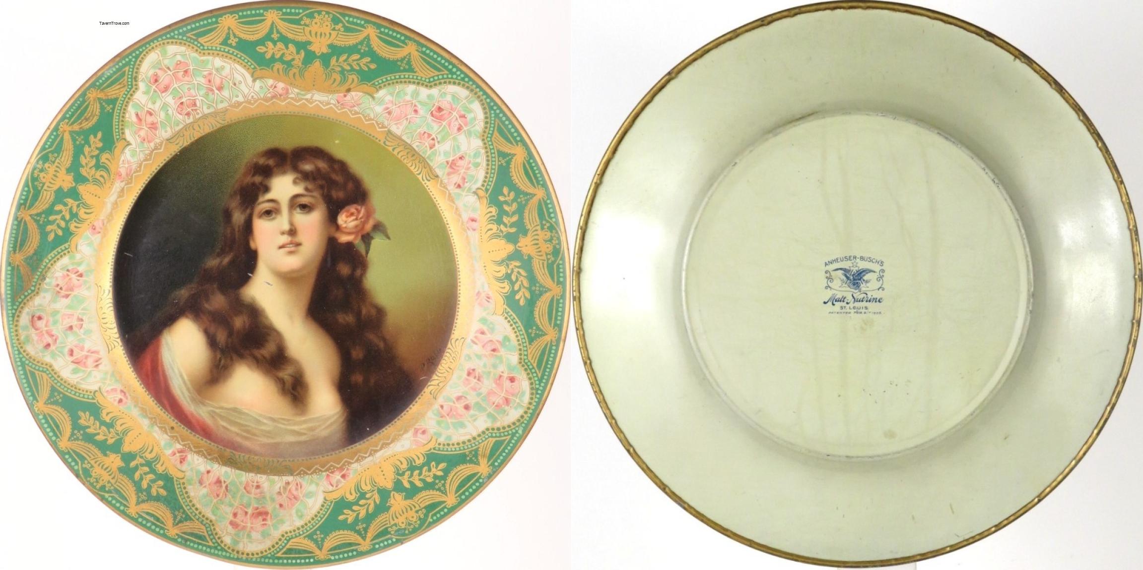 Was essentially a giveaway from Anheuser Busch to promote their Malt Nutrine product. An interested customer was to send 12 Malt Nutrine Bottle Caps plus 15¢ postage for one "Vienna Art Plate". One of two available from Anheuser Busch at the time. The boobs were covered up for the later versions, creating another set of two. Made by the H.D. Beach Co. of Coshocton, Ohio.